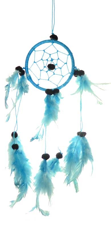 Only allow your good dreams to slip through the webs of this dream catcher. This turquoise colored dream catcher is a replica ot the traditional dream catcher with the feathers and beads. 2 1/2" x 9"