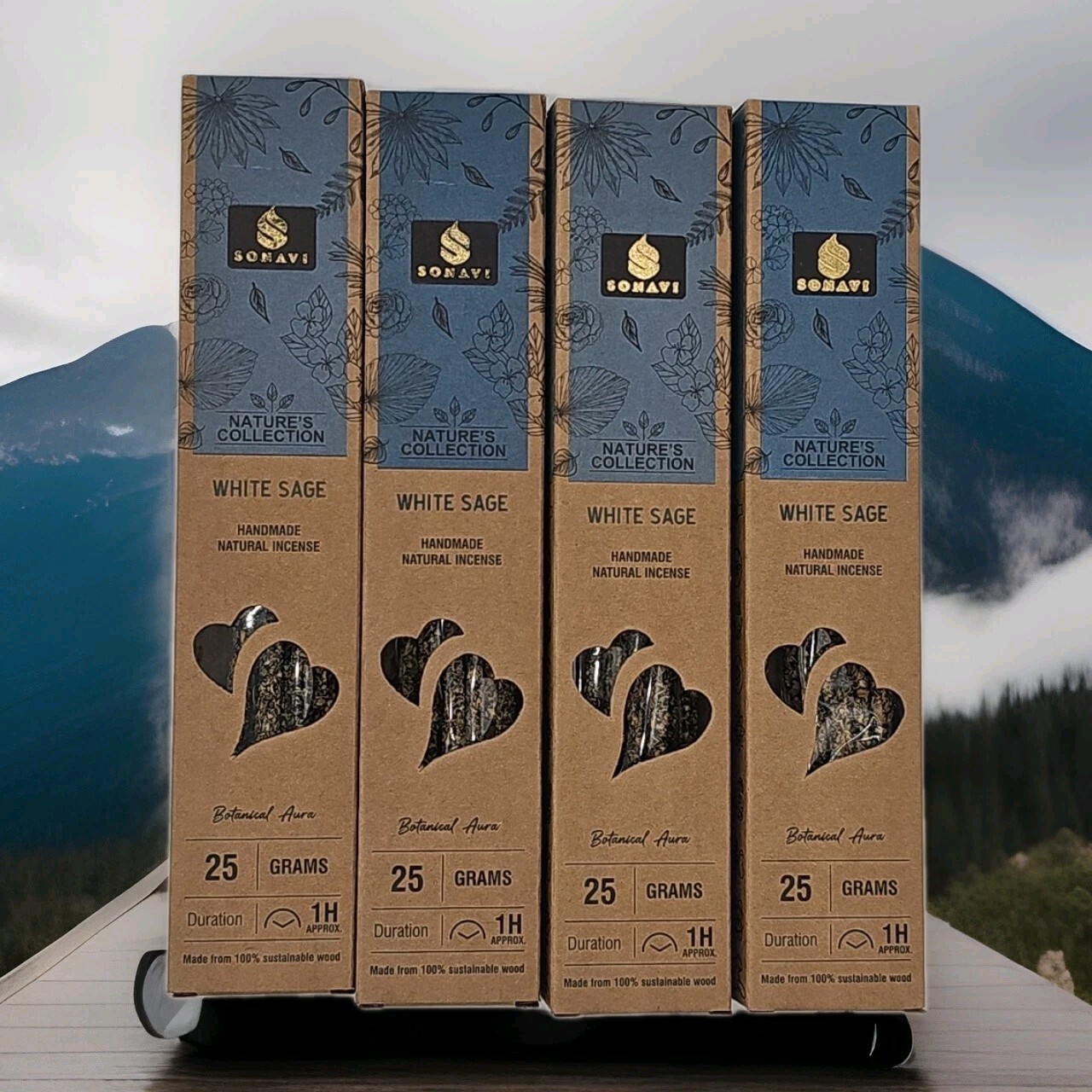 4 Boxes of Sonavi Premium Handcrafted White Sage Incense Sticks. 25gm per box.
